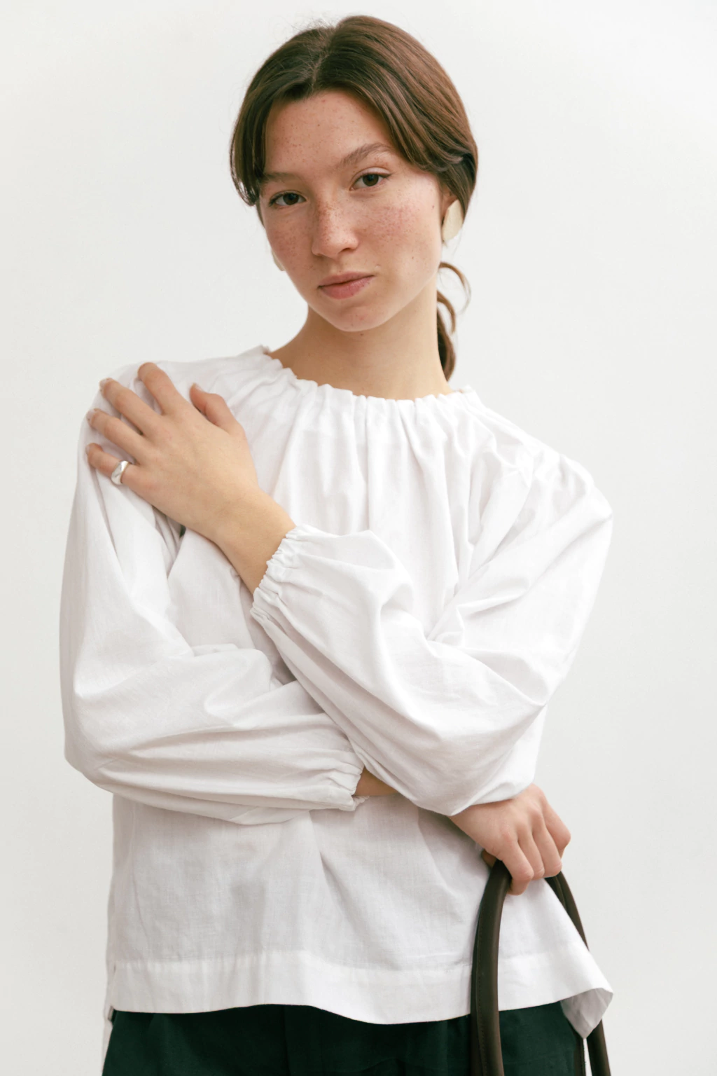 Be es un top camisero de mangas largas confeccionado en poplin, 100% algodón. Sus puños cuentan con un elástico que permite que peudas vestir la pieza con las mangas largas o que lo ajsutes a la altura del brazo que más te guste para la ocación generando frunces.